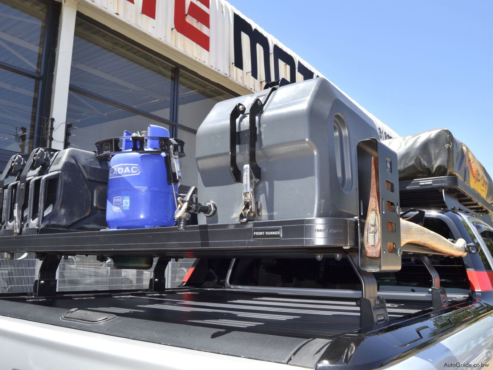 Nudge Bar. Eezi-Awn Tent. Front Runner Roof Rack. Anti Smash & Grab Tint. Push Start Button. Electric Front Seats. Front Runner Water Can. Jerry Cans x2. Cadac Gas Bottle. Axe. Front Runner Utility Rack. Securi-lid. Tow Bar